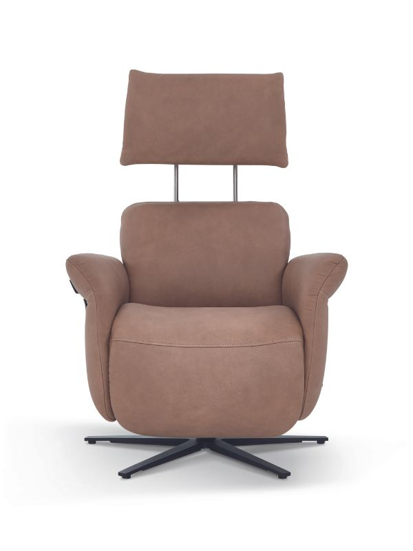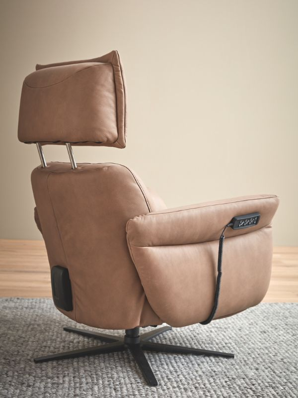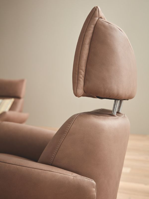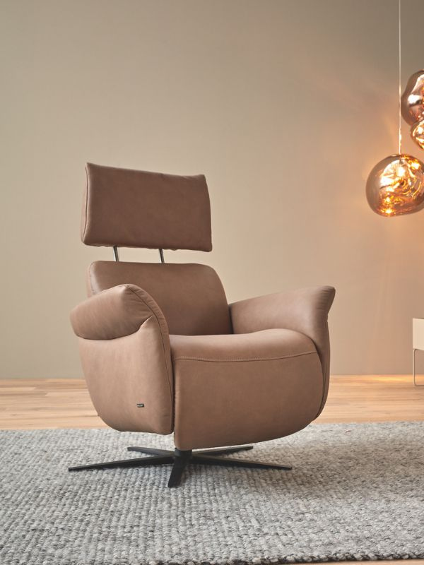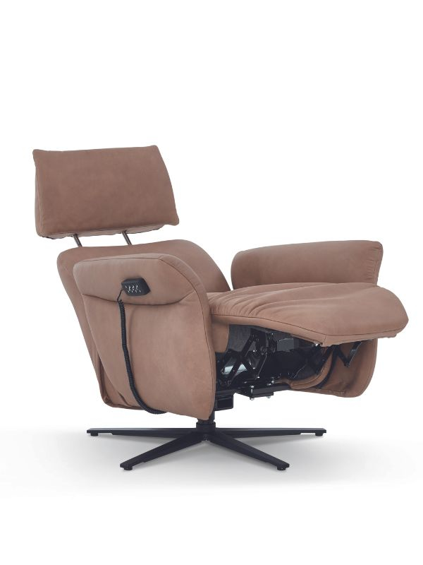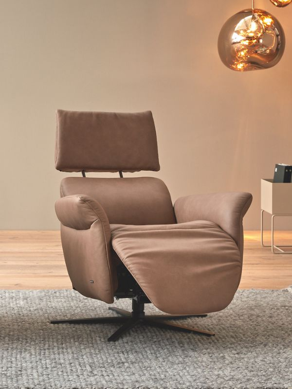 Deze compacte relaxzetel is verkrijgbaar in drie verschillende maten. De standaarduitrusting bestaat uit elastische golfvering, omhuld met zachte kussens, en een comfortabele beensteun die zowel elektrisch als handmatig verstelbaar is. Een bijzonder kenmerk is de verstelbare hoofdsteun, die ook in hoek aanpasbaar is. Dit model biedt vijf functionele varianten. U kunt kiezen voor handmatige bediening of elektrische bediening met maximaal drie motoren en een opsta-hulp. De elektrische varianten worden bediend met handschakelaars, waarmee u eenvoudig de ideale relaxpositie kunt instellen.